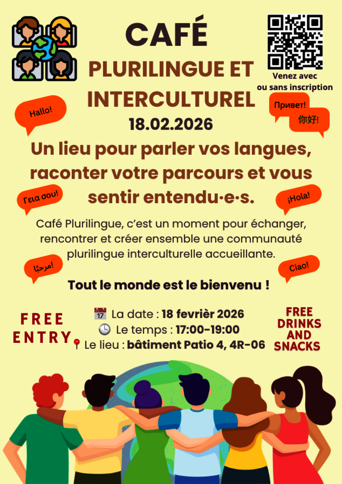 We are pleased to invite you to our Multilingual and Intercultural Café, a friendly gathering where students from all faculties can practice different languages, chat freely, and meet new people. Whatever your level, you are welcome !