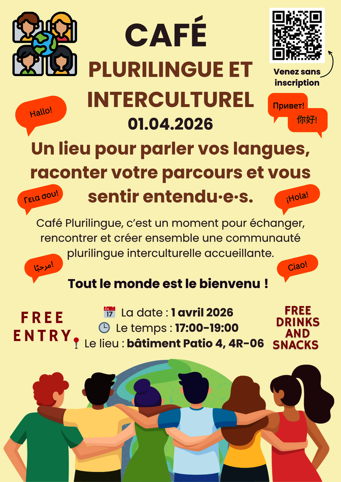 We are pleased to invite you to our Multilingual and Intercultural Café, a friendly gathering where students from all faculties can practice different languages, chat freely, and meet new people. Whatever your level, you are welcome !