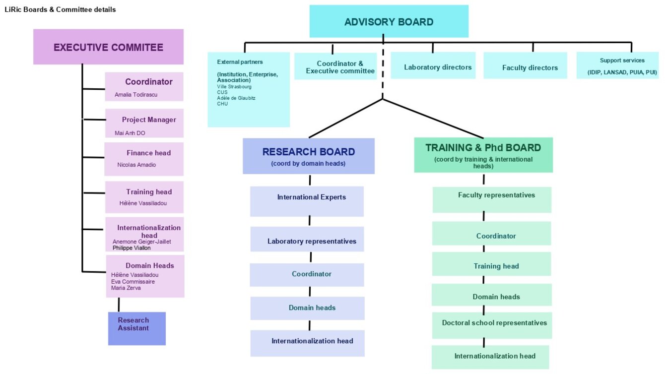 Le comité exécutif comprend : la coordinatrice, la manager de projet, les responsables des trois domaines, le responsable formation, la responsable internationalisation, le responsable finance et le responsable communication. Le comité exécutif est coordonné par la coordinatrice et se réunit en tant que de besoin ; c'est l'organe opérationnel qui gère les activités de LiRiC au quotidien.