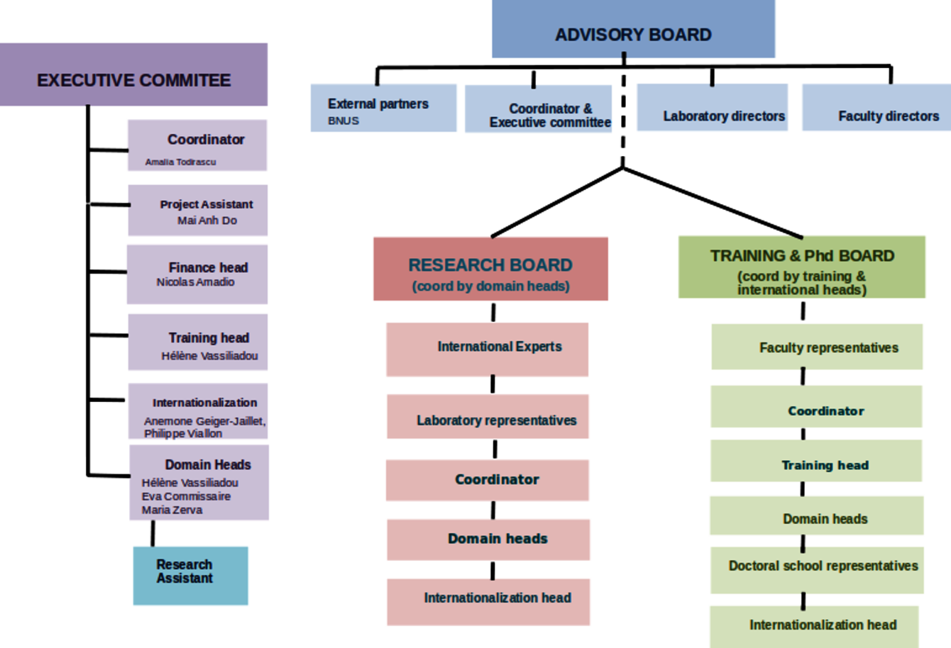 Le comité scientifique comprend : la coordinatrice, les responsables des trois domaines, les experts internationaux, les représentant·es des laboratoires, la responsable internationalisation. Il a pour mission d’expertiser et d’évaluer les actions de recherche, de proposer des orientations, de rendre un avis sur les réponses des appels à projets (les experts internationaux sont notamment sollicités sur ces points), de proposer des initiatives de collaboration et de développement, ainsi que de veiller à l'organisation des événements scientifiques. Le comité scientifique est coordonné par les responsables de domaines (de façon tournante entre les trois domaines) et se réunit en tant que de besoin.